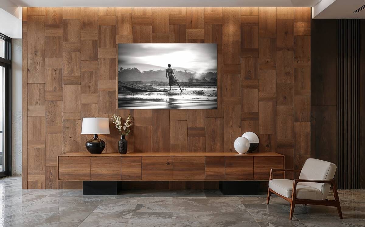 Votre choix de photos dépend autant de l’usage de la pièce que de sa lumière naturelle. Dans un salon orienté plein sud par exemple, un noir et blanc contrasté absorbe l’éclat du jour sans paraître terne. Privilégiez des images graphiques, des architectures géométriques et des portraits aux ombres marquées. À l’inverse, une chambre exposée au nord gagne en douceur avec des clichés aux demi-teintes, des paysages brumeux ou encore des scènes de plage où la lumière diffuse joue sur les vagues.
